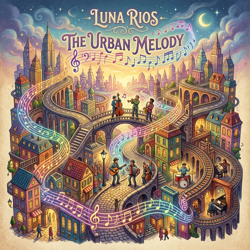 An urban, whimsical labyrinth scene intended for a music artist's album cover. The labyrinth is composed of city structures like skyscrapers, roads, and bridges, twisted together in an intricate, archaic, and playful manner, giving the scene a dreamy, surreal vibe. Street musicians, playing different instruments can be seen at various corners of the maze, contributing to the urban melody. The cover is adorned with musical notes flowing around, intertwining with the city landmarks, symbolizing the deep bond between the city and music.