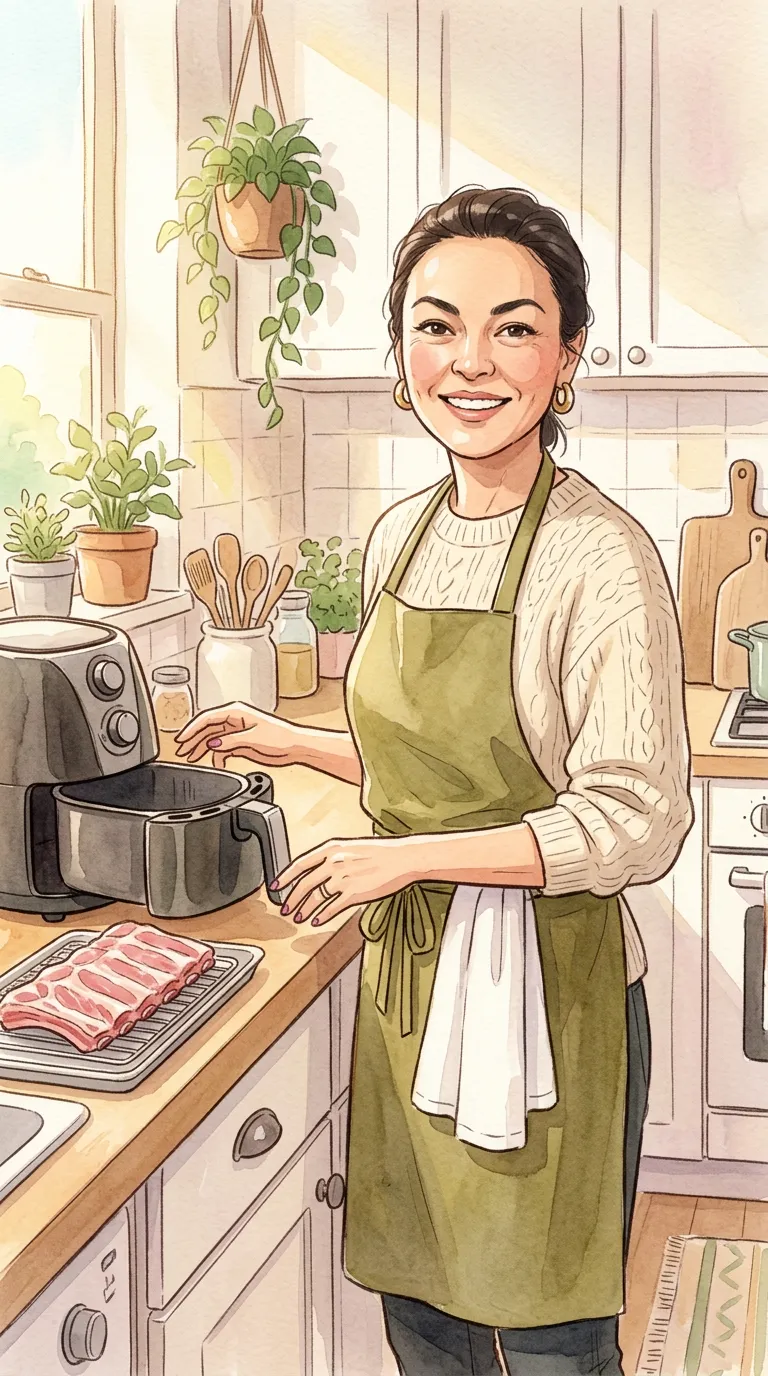 Using the provided reference image of a person while preserving their exact facial features and core identity, medium shot, they stands beside the counter facing camera with one hand near the air fryer basket. The person is wearing soft cream knit sweater, olive apron, dark trousers, simple kitchen towel tucked at the waist. The scene is set in A cozy pastel kitchen counter with an air fryer and a rack of raw pork ribs in a Studio Ghibli-inspired watercolor scene. soft morning window light with warm pastel highlights. Their expression is inviting, confident. . Studio Ghibli anime style, watercolor backgrounds, whimsical atmosphere, hand-drawn aesthetic, soft pastel colors