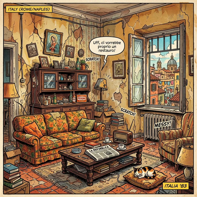 Old Italian apartment with outdated furniture and walls needing renovation, in a colorful comic book style