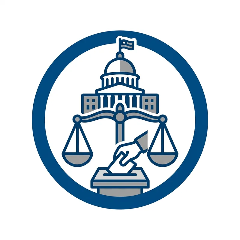 Create a vector icon that represents a government or democracy. Picture a circular shape incorporating symbols that are traditionally associated with governance and democracy. For instance, it could include scales, symbolizing justice, a ballot box indicating voting, or the image of a government building such as a capitol or parliament. It should be simple, clean, and easily recognizable with bold lines, using a limited color palette of blue, white, and grey.