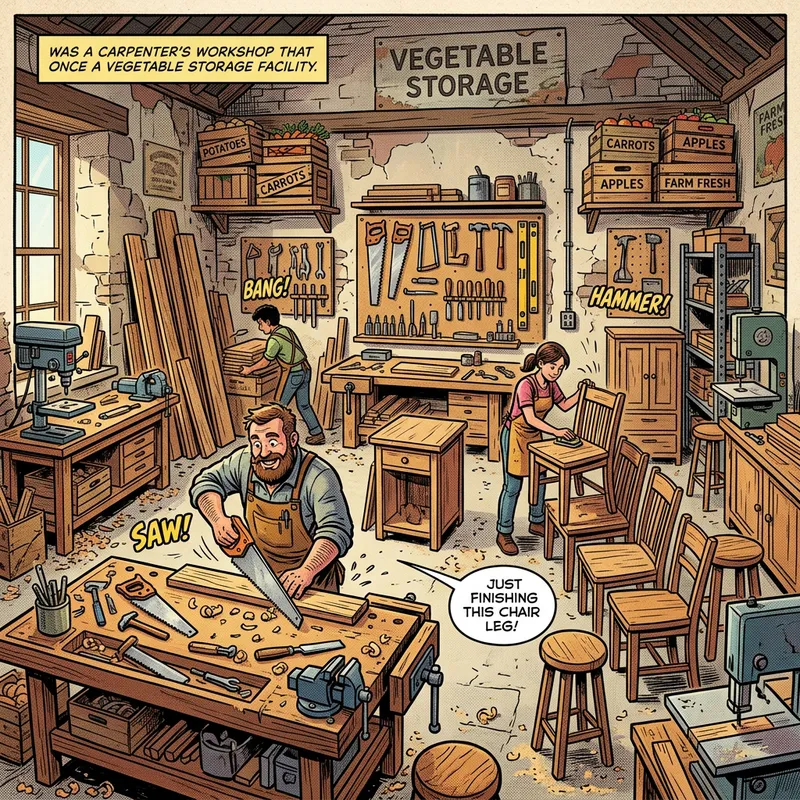 An image of a vegetable storage converted into a carpenter's workshop, portrayed in a comic book style. The scene is vivid with multiple wooden artefacts in the making. Workbenches are arranged systematically and tools are neatly placed. Some freshly made wooden chairs, tables, and cupboards are scattered around. The walls retain signs of its past use with the vegetable crates stacked in a few corners. The environment is lively and animated like the frames of a comic book.