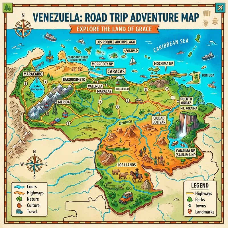 A realistic, isometric map of Venezuela designed to promote road trips throughout the country. The map should feature major highways and popular tourist destinations. It should be done in a vibrant, colorful style to reflect the diverse ecology of Venezuela. Interesting landmarks and national parks should be highlighted, perhaps with miniature, stylized representations. The roads should be clearly visible, with some suggestion of terrain for added interest. The overall design should inspire travelers to explore the rich cultural and natural heritage of Venezuela.
