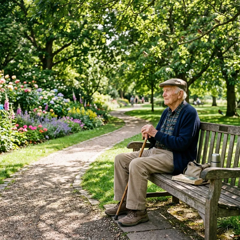 An extremely old Caucasian man is sitting on a bench in a park. He is clad in a simple, comfortable clothing suitable for the outdoors. Tall trees with dense foliage provide a canopy over the path, while flower beds add vibrant color to the scene. The sunlight filtering through the leaves casts dappled light and shadows on the pathway and the green grass. This serene setting creates a peaceful atmosphere, with the chirping of birds adding to its charm.