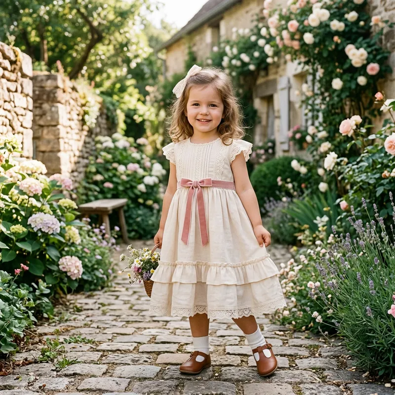 Romantic dress for girls size 2-5, European style without print, with decorative cut and ribbon at the front.