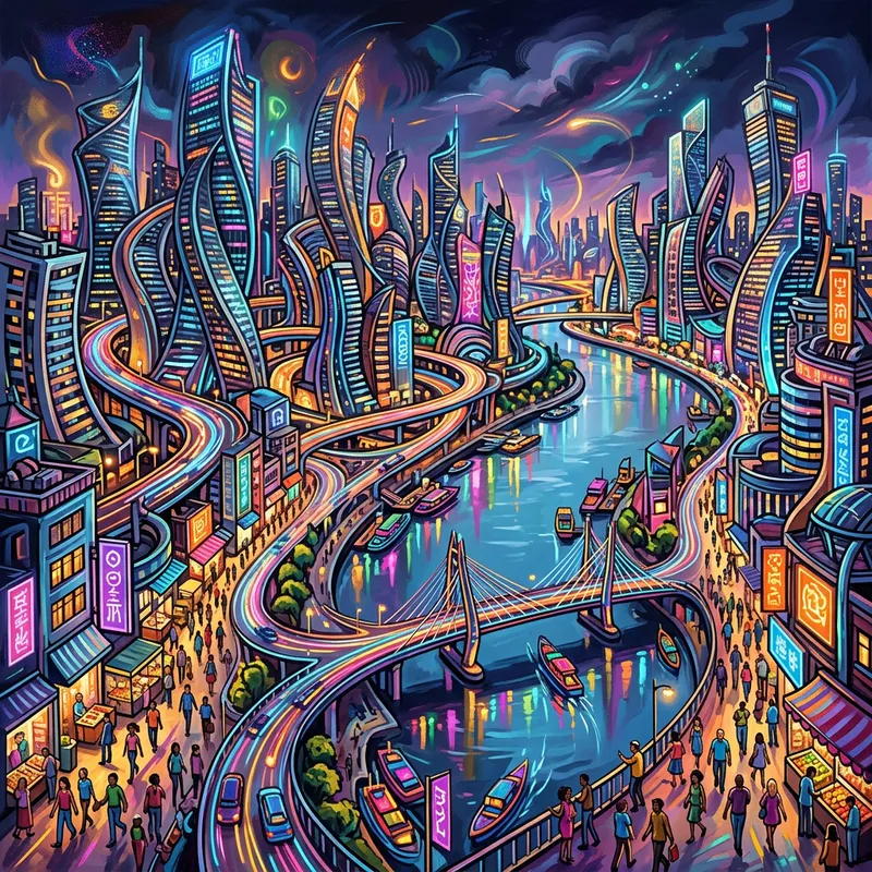 Visualize a sprawling cityscape in an abstract style. This should capture the intricate architectural details of stunning skyscrapers, twisted roads filled with neon lights, lively pedestrian walkways brimming with people of different genders and descents such as Caucasian, Black, Hispanic, and South Asian. The scene should also portray bridges over calm, reflective rivers. The abstraction may be portrayed through distorted or exaggerated architectural forms as seen from a broader perspective, not adhering strictly to reality but maintaining a perfect balance of unrealistic creativity. The entire image should exude a lively, energetic and vibrant atmosphere.