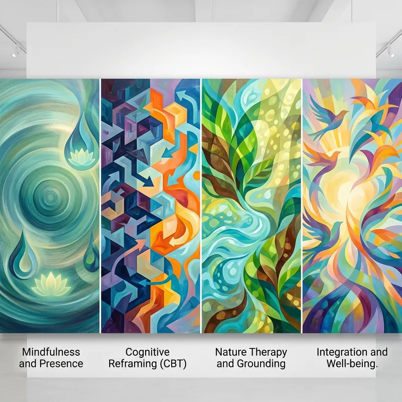 Generate a vibrant sequence of abstract images representing the idea of mental health and recovery. Let these pictures visually interpret different therapeutic practices. Some could exhibit quiet meditation spaces filled with mindfulness symbols, others might show interlocking patterns symbolizing cognitive-behavioral therapy, and some might express soothing outdoor environments conveying nature therapy. The abstraction should invite viewers to grasp the non-tangible aspects of mental health therapies. Though the elements are symbolic, they should pulsate with colors, suggest movement and evoke a journey towards healing and well-being.