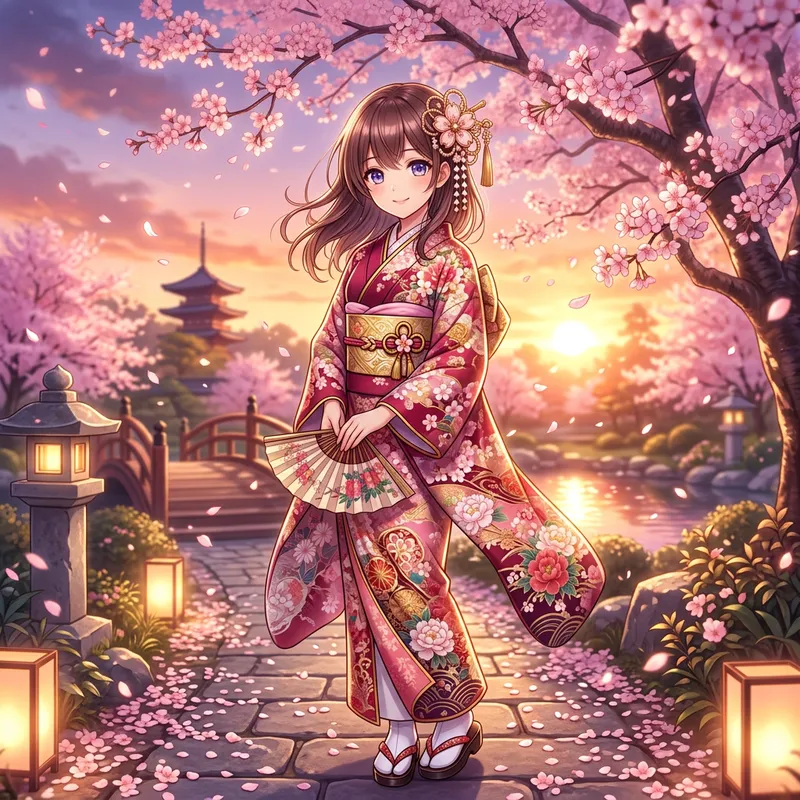 Generate an image of a female anime character with vibrant eyes, wearing a traditional Japanese kimono with elaborate floral designs, her silky brown hair adorned with a gold hairpin. A cherry blossom tree is blowing in the background, adding to the serene atmosphere of the image. The setting sun is casting a warm glow across the scene.