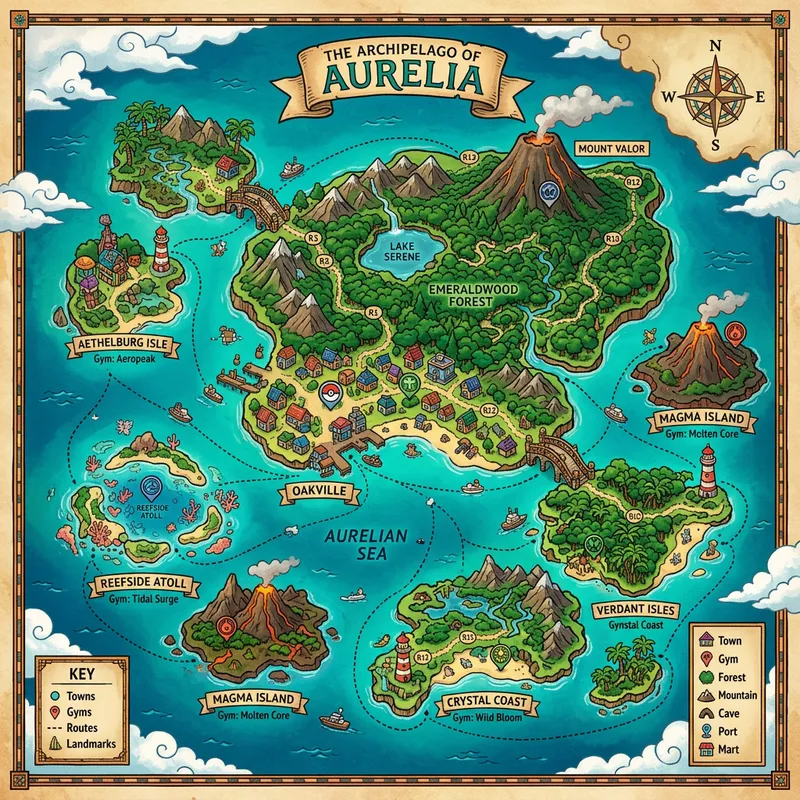 Generate an image of a fictitious map inspired by the archipelago geography of the Philippines. The map should depict various unique locations such as mountains, forests, and bodies of water. Additionally, include depictions of whimsical, stylized structures reminiscent of houses, bridges, and gyms you might find in popular creature-catching video games. The color palette should be vibrant and lush, reflecting the diverse natural beauty of the Philippines.