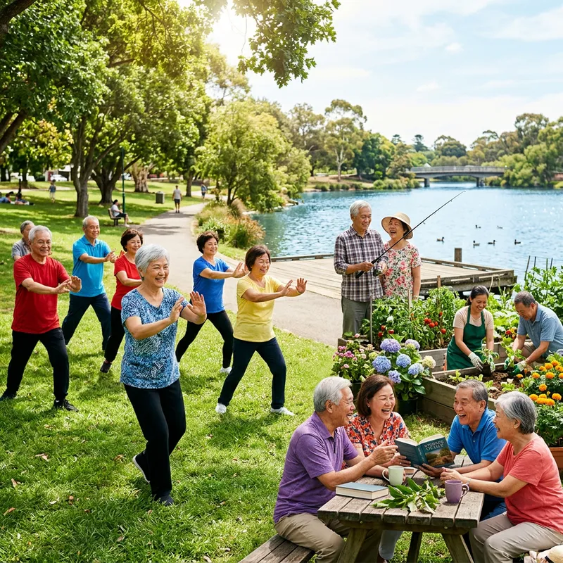 A vibrant scene showcasing a group of joyful senior citizens of Asian descent leading a positive lifestyle. Several individuals are engaged in a variety of invigorating activities, like practicing Tai Chi in a lush green park, enjoying hobbies like painting, birdwatching, or fishing by a tranquil lake, discussing a book in a cozy corner, or nurturing plants in a community garden. They are all dressed in comfortable, brightly colored attire, radiating positivity and verve. The backgrounds are colorful and full of life, with sun-rays illuminating the scene, suggesting daytime.