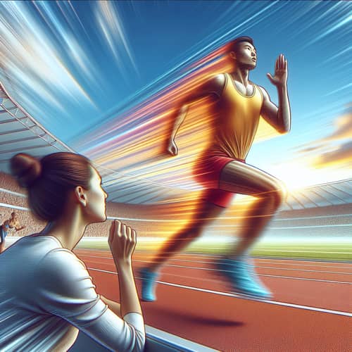 An image capturing the essence of athleticism in high contrast and vibrant colors. The scene depicts a runner of Asian descent, wearing neon sports attire, about to cross a finish line, her sinewy muscles bursting with strength and determination. The background features a dynamic crowd of diverse races and genders, cheering her on. The entire scene is bathed in sunlight, casting dramatic shadows that amplify the high contrast in the image. The runner's neon attire, the multicolored crowd, and the vivid blue sky create a burst of vibrant colors setting the mood of the scene.