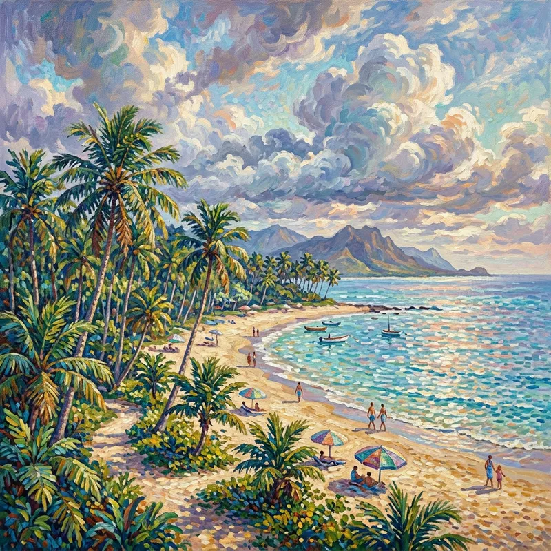 Neo-Impressionist Palm Trees on Vibrant Beach Landscape