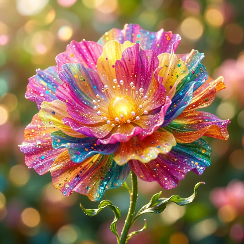 A beautiful flower reminiscent of a birthday celebration, with petals spread out joyfully like the skirts of a dancer, sparkling with vibrant colors that express joy and radiance. The heart of the flower is like a tiny sun, the source of its incomparable charm. Sparkling, iridescent