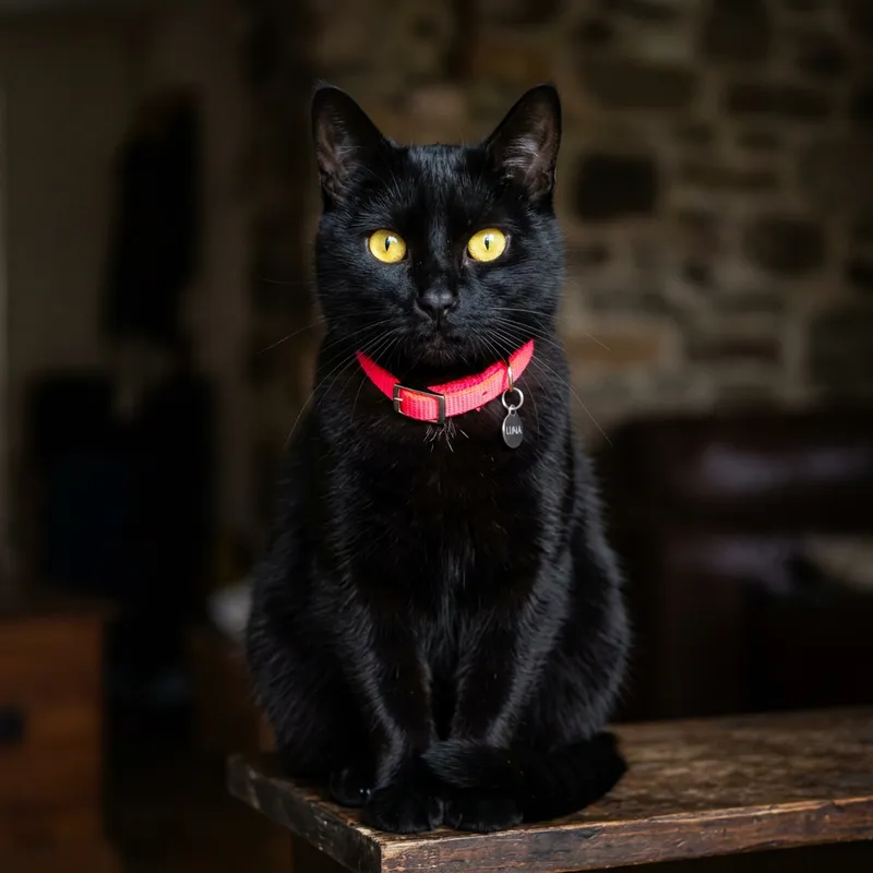 Vibrant Black Cat with Bright Yellow Eyes and Pink Collar