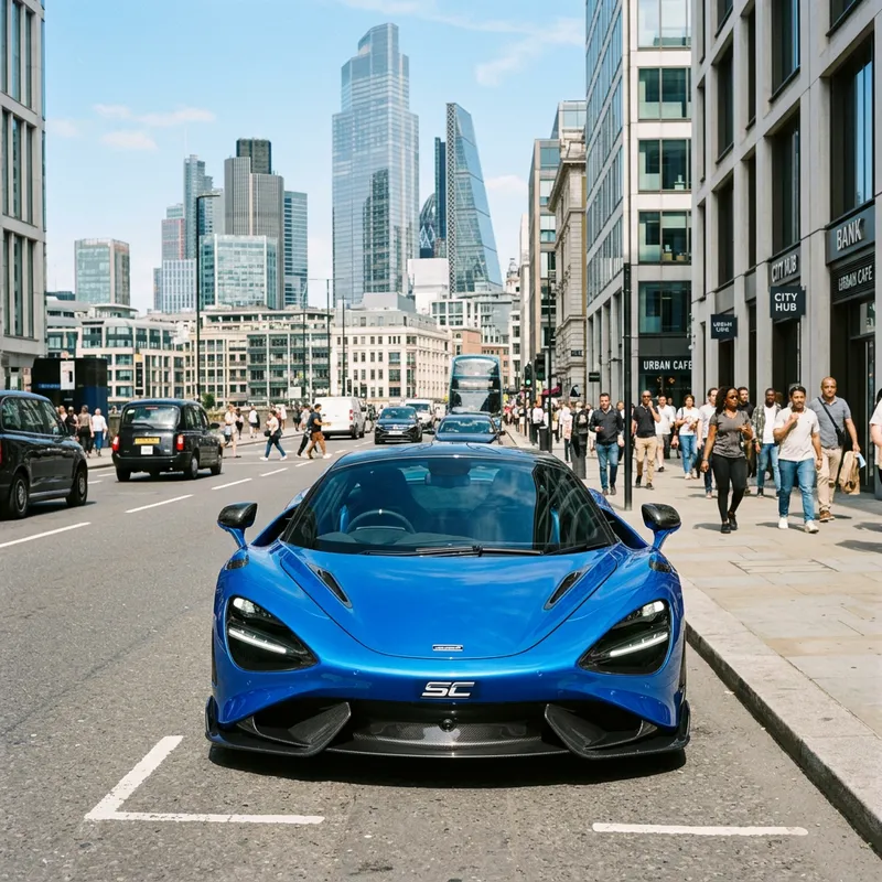 Visualize a cityscape during daylight. It's a typical day with a clear blue sky overhead. In the forefront, there is a sleek, aerodynamically designed sports car that is painted in a vibrant shade of blue. The car is sans any visual obstructions, providing a detailed front view. The car's distinctive features like its LED headlights, streamlined shape, and shiny hood are clearly visible. The city around the car hums with life, with high-rise buildings, people milling about, and the hustle and bustle of urban living completing the backdrop. The image resonates with the energy and allure of modern city life.