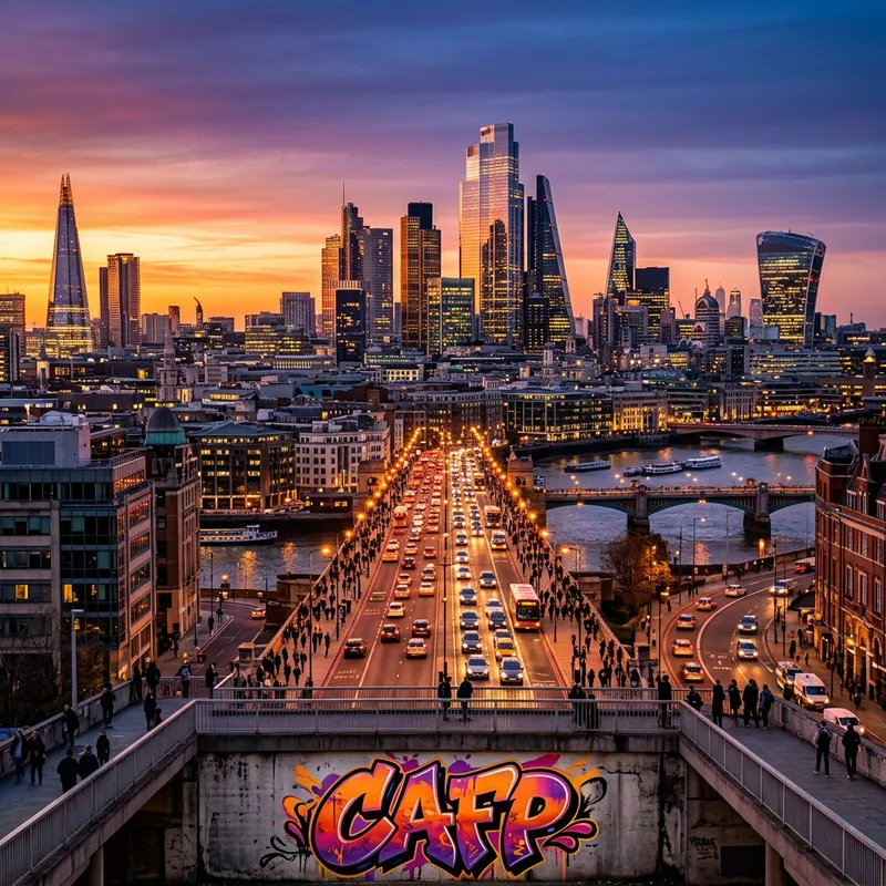 Imagine a vibrant and bustling city with a skyline filled with towering buildings, reflecting the early evening sun on their glass panels. Streetlights are just starting to flicker on, casting a warm glow on the streets below. The sky above offers a beautiful gradient of sunset colors transitioning from orange to deep purples. At the bottom of the image, let the word 'CAFP' appear in bold and stylish letters, possibly in a graffiti-style or an elegant font, effectively reflecting the urban aesthetic of the city above.