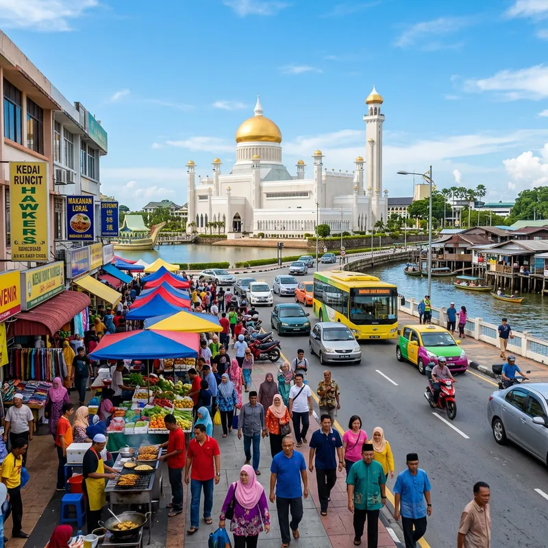A lively cityscape photo of Bandar Seri Begawan, the capital of Brunei. The streets are bustling with diverse people of various descents and genders busily going about their day, with the iconic golden-domed Sultan Omar Ali Saifuddien Mosque in the background under a clear blue sky. Splashes of vibrant colors come from the array of market stalls selling goods and food. Traditional wooden water village houses are visible towards the river edge.