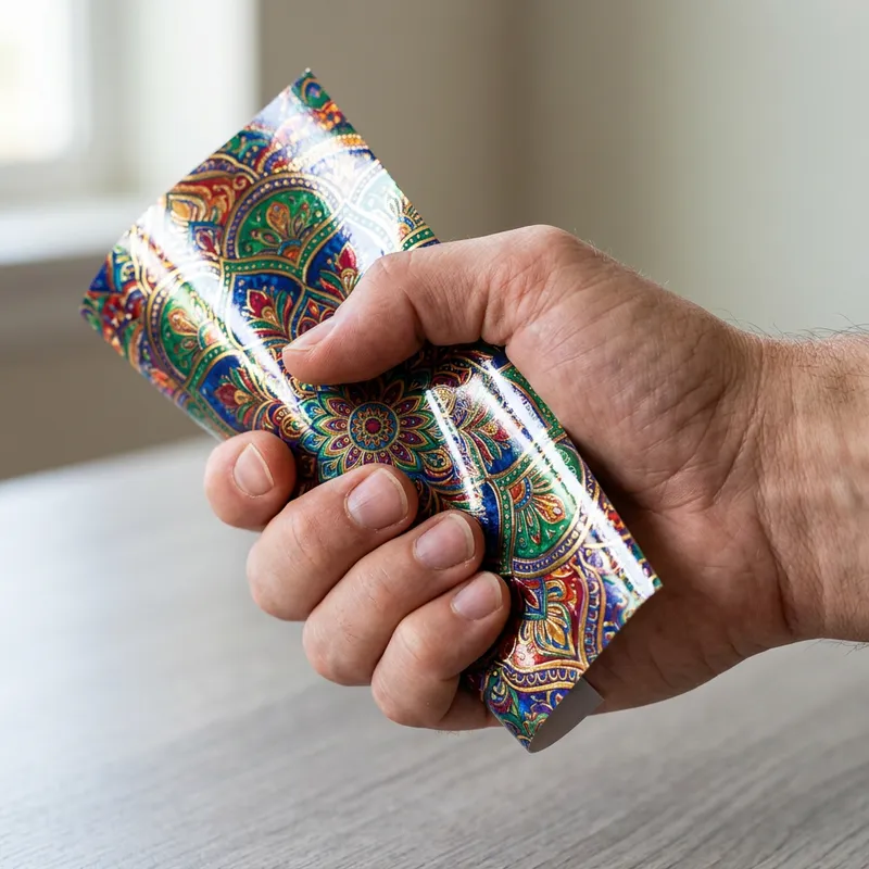 Detailed visualization of a human hand securely grasping a piece of glossy paper. The paper should illuminate vibrant colors and carry an intricate print design. To enhance the glossiness, light reflections or slight shimmer should be perceptible on the surface of the paper. The background should be minimalist, to put more focus on the hand and the brightly colored piece of paper.