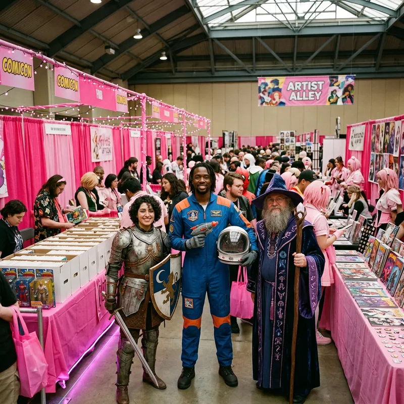 A lively scene at a comic convention, often referred to as Comicon. Entreating your imagination to envision an array of booths, proudly exhibiting an eclectic collection of comic books, merchandise, and memorabilia. Amidst the bustling crowd, we see individuals of various descents and genders, dressed in elaborate costumes, their enthusiasm palpable. Vibrant cosplayers include a Middle-Eastern woman emulating a medieval knight, a Black man portraying a space explorer, and a Caucasian man appearing as a fantasy wizard. The atmosphere of this convention scene is further enhanced by an overarching pink theme, from booth decorations to cosplayers' accessories, lending an effervescent and cheerful vibe to the entire scenario.