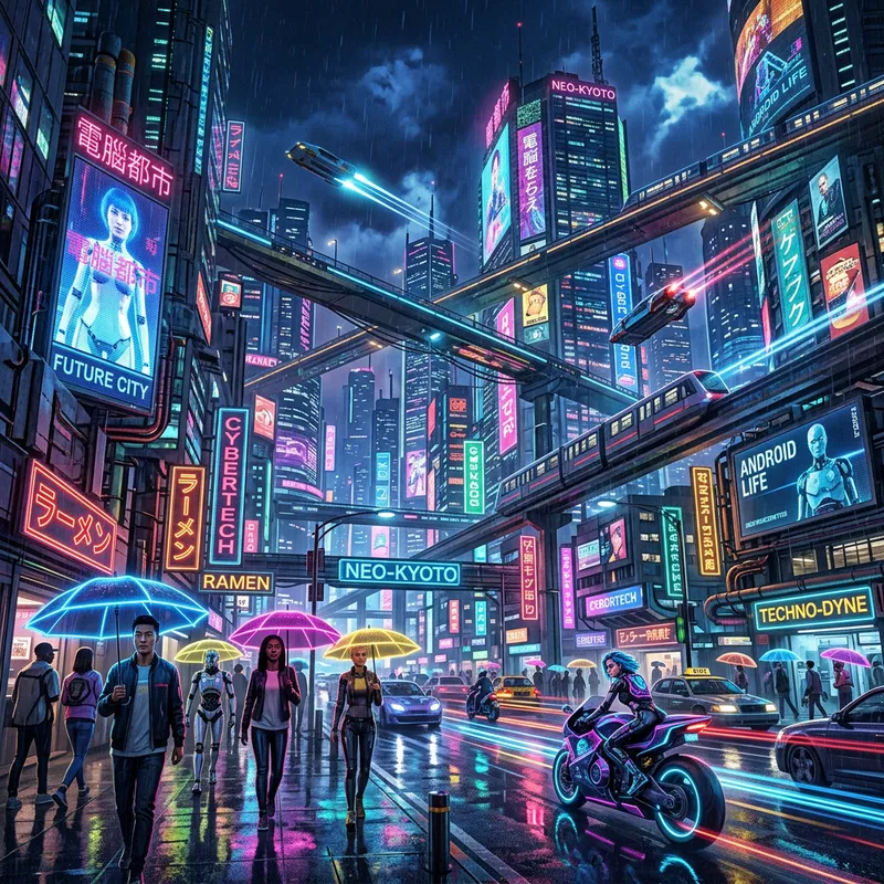 A dynamic cityscape showcasing the characteristic vibrancy and high-tech element of the Cyberpunk genre. Tall buildings sheathed in neon lights pierce the cloud-marked night sky. A vast network of aerial walkways and suspended highways crisscross between the structures glowing in hued lights. Rain-soaked streets below reflect the radiant cityscape just as colossal video billboards animate the skyscrapers. Various humanoid robots and citizens of diverse descents and genders navigate the city, some walking under neon-lit umbrellas, some on flashy high-tech motorcycles, and a few inside futuristic vehicle pods whizzing past.