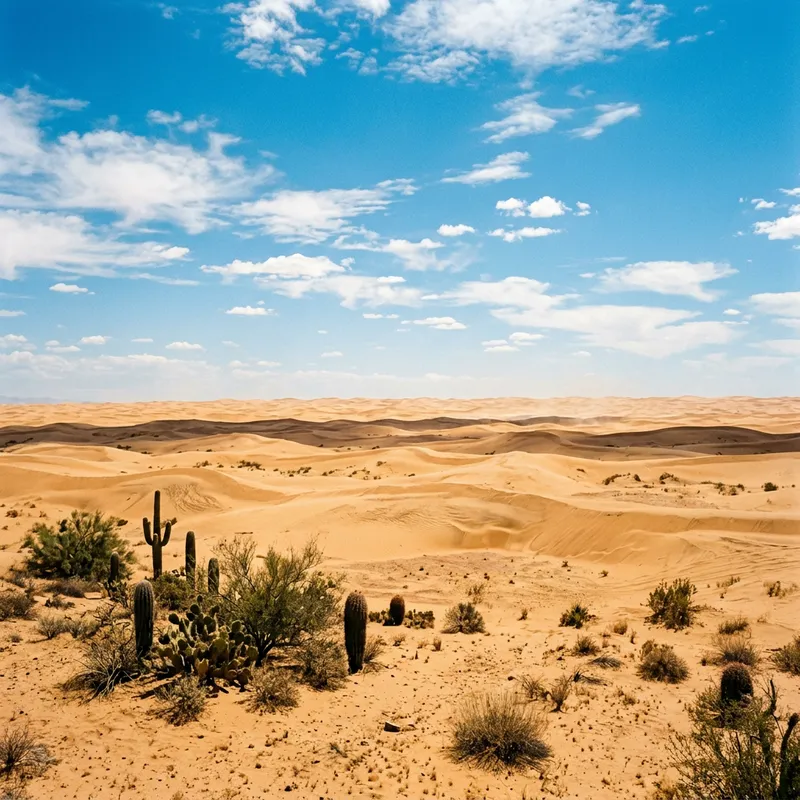 Imagine an expansive desert landscape under a vibrant, hot sun. The ground is blanketed with loose, shifting sands, and the horizon seems to stretch endlessly in every direction. Sparse vegetation, like resilient cacti and scrub bushes, dot the otherwise barren terrain. Occasionally, as the wind blows, it creates swirling patterns in the sand. Heat waves radiate from the sizzling sand dunes, distorting the view in the distance. A few sparse clouds hang in a clear, azure sky, casting moving shadows on the endless dunes. The overall atmosphere is one of solitude and silence.