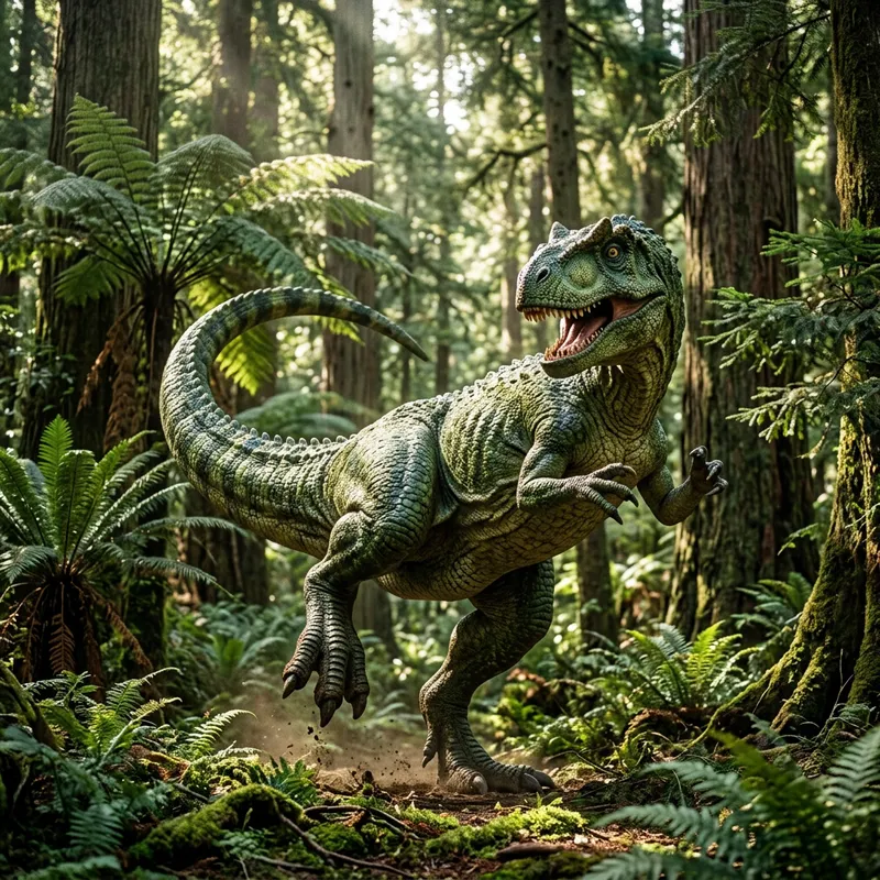 A vibrant scene featuring a large dinosaur with incredibly detailed, rough-textured, green scales. The dinosaur, standing tall on its hind legs, is engaged in a joyful dance. Its small arms are swaying rhythmically, and its tail curls and sways in sync with its movements. Its eyes, gleaming with excitement, look ahead as it kicks one leg mid-air. The background is lush and filled with old, towering trees, perhaps hinting at the Jurassic era it hails from. Sunlight streams through the dense canopy, casting beautiful, dappled patterns on the dinosaur's dancing figure.