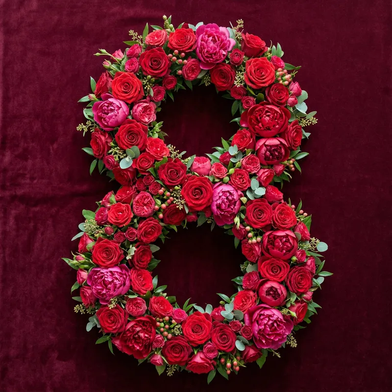Visualize a rich burgundy background filled with a large number 8. The 8 is intricately outlined with an assortment of vibrant red roses and charming peonies, their petals full and lush. The flowers are a vibrant contrast to the deep burgundy background, making the outline of the number 8 stand out prominently.