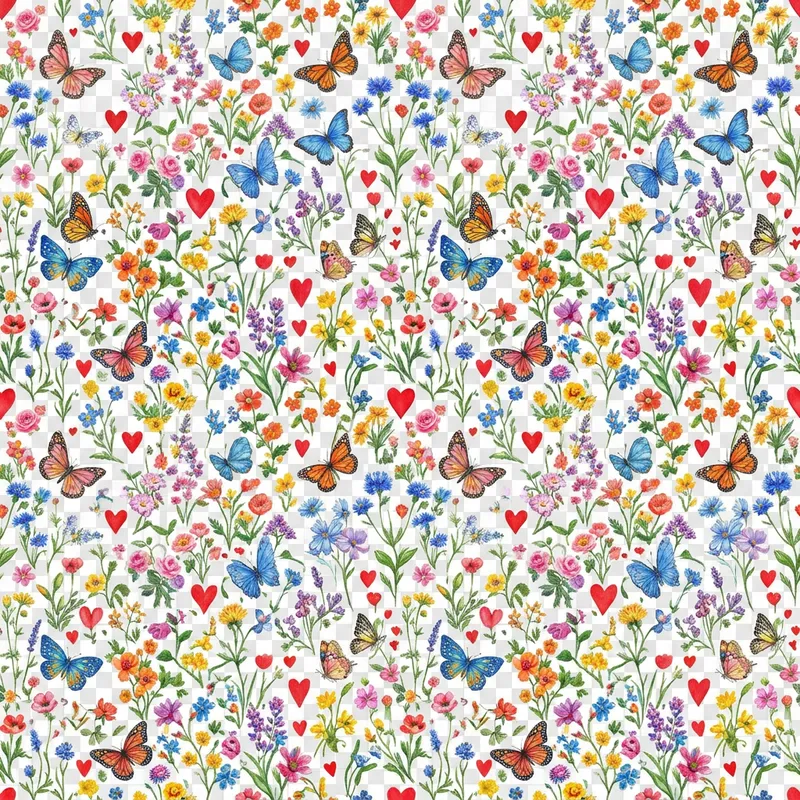 An image featuring an assortment of very small, vibrant flowers in various hues. Alongside these flowers are small, colorfully detailed butterflies fluttering about. Interspersed within this scene are small, red heart shapes, precisely cut out, all set against a transparent background creating a lovely and delightful pattern.
