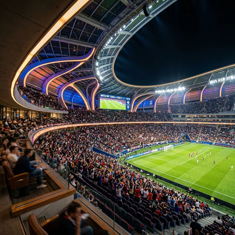Vibrant football stadium, experimental architecture, curved lines, dynamic shapes, bold colors, tiered seating arrangement, individual chairs, ergonomic design, premium materials, luxury suites, panoramic views, natural ventilation, LED scoreboards, spotlights, night atmosphere, warm ambient lighting, shallow depth of field, 1/1 composition, realistic texture, ambient occlusion.