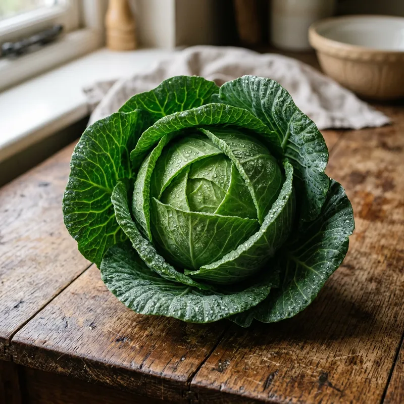 A realistic and detailed close-up image of a fresh green cabbage, with its densely layered, waxy leaves forming concentric circles. The cabbage is sitting on a worn wooden table, bathed in soft sunlight, and there are droplets of water on the leaves, giving them a fresh, dew-kissed appearance. The vibrant green color contrasts strikingly with the soft brown of the table, creating an aesthetically pleasing scene.