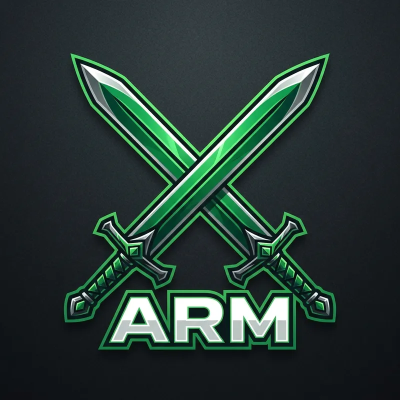 Design a logo containing two vibrant green swords crossing each other. The swords should be depicted in a style that conveys strength and precision. Underneath the crossed swords, incorporate the word 'Arm' in a bold and eye-catching typeface.