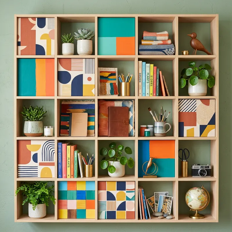 A grid-style arrangement of mixed elements. The grid could consist of several blocks - some displaying abstract geometric patterns, others filled with various colours, and more with greenery like succulents or small shrubs. Some blocks might include a mix of everyday objects such as books, writing materials or ornaments. The entire view should present an organized, yet intriguing and visually vibrant composition, with aesthetically pleasing contrast between each block.