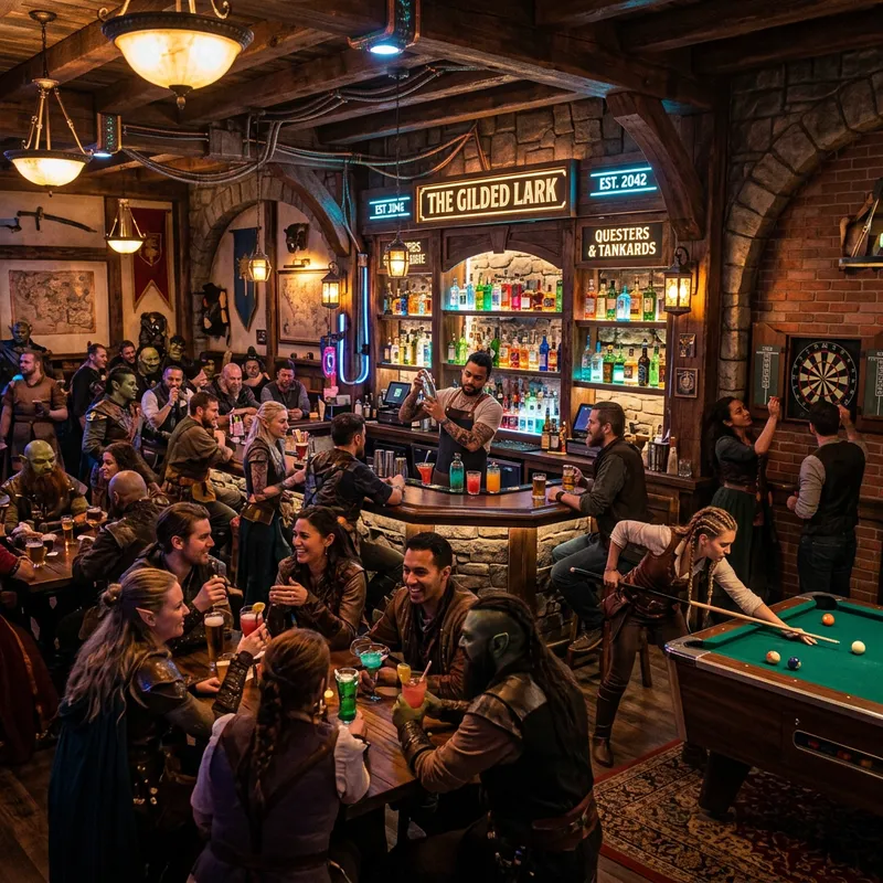 A bustling bar scene embellished with a stylistic blend of modern architectural elements and old-fashioned decor typically found in a video game setting. Patrons of diverse descents and genders are spanning around the room with some engaged in animated conversations, while others appreciate their drinks. A barkeeper is skillfully mixing cocktails with deftness, showing a wide array of colorful liquor bottles nicely exhibited behind him. Dimmed ceiling lamps complement the atmosphere with a soothing twilight glow. A pool table in a corner witnesses a competitive match, and a dartboard hangs from the adjacent wall.