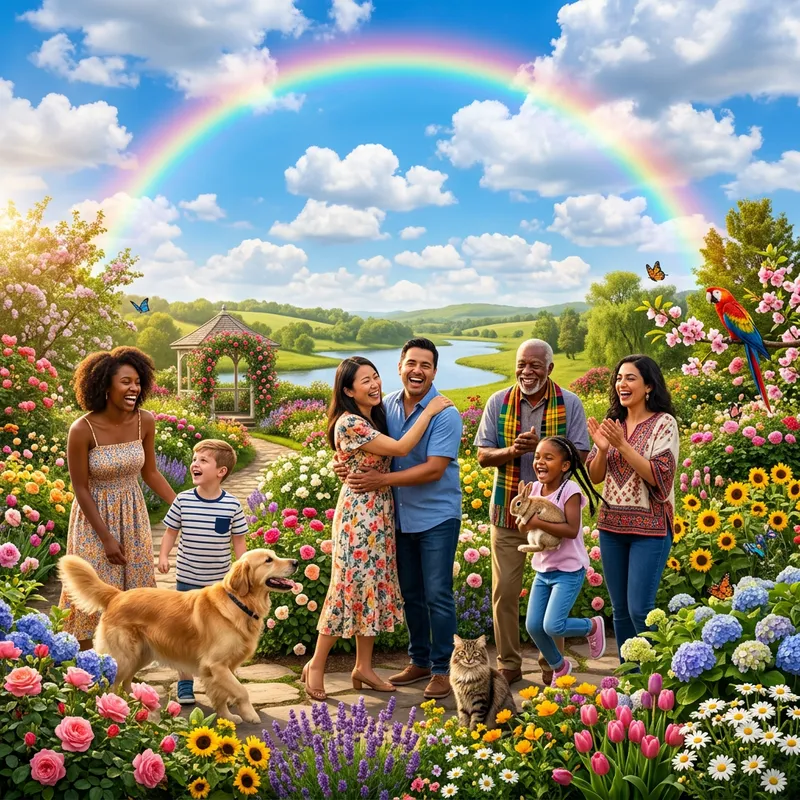 Generate an image that is infused with vibrant colors. It should reflect emotions of joy and positivity, with elements like a bright sky filled with fluffy clouds, a beautifully blooming garden bathed in sunlight, a rainbow arching grandly, and friendly animals as if they are interacting joyfully. Also incorporate human figures of diverse descents and genders, all sharing in this scene's elation and camaraderie. There should be a palpable sense of harmony and happiness pervading the entire scene, making it unmistakably inspiring and uplifting.