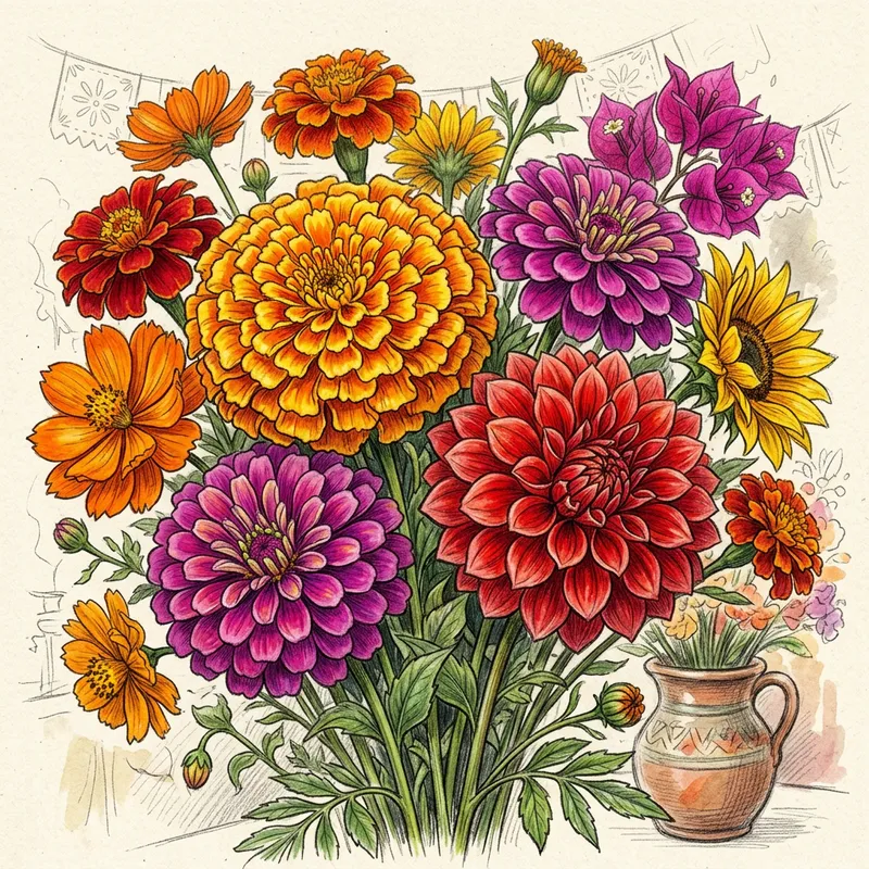 A detailed sketch of vibrant Fiesta flowers typically seen during Mexican celebrations. The flowers should exhibit a range of colors like red, orange, yellow, and purple, to symbolize the festive spirit. They are often large, with plentiful, layered petals that create a full, voluminous look. The petals show a variety of gradations, from light at the center to dark at the edges, which gives them depth. Each flower should stand out, with its own unique shape and color saturation. The sketch should also capture the textures of the flowers, from the delicate petal edges to the sturdy flower stems.