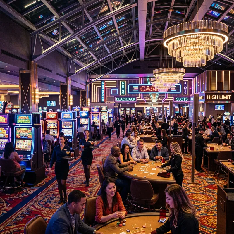 An opulent, energetic casino emanating with life and lit vibrantly with neon lights. The interior is designed contemporarily with plush furnishing and vibrant rugs. Rows of gleaming slot machines line one side of the casino, and a range of tables for card games populate the other side. Gamblers of various descents and genders are engrossed in their games, contributing to the buzzing atmosphere. Cocktail waitresses traverse the busy floor, delivering drinks to the patrons. High above, chandeliers illuminate the scene with a warm, inviting glow. The design integrates elements of steel, glass and neon for a harmoniously modern aesthetic.
