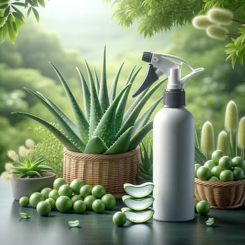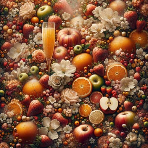 A vibrant green can of a popular citrus-flavored soda, in the foreground, with an Art Nouveau design. Behind it, a meticulously detailed model of an AK-47 rifle with a wooden body, made from garden plants and flowers. Its structure meticulously represents the main features of the rifle but entirely composed of botanical elements. Further back, the sprawling landscape of a large Latin American city with its distinctive skyline including colonial-era buildings and modern skyscrapers. The sky is painted with hues of the evening sun setting, lending a warm orange glow to the scene.