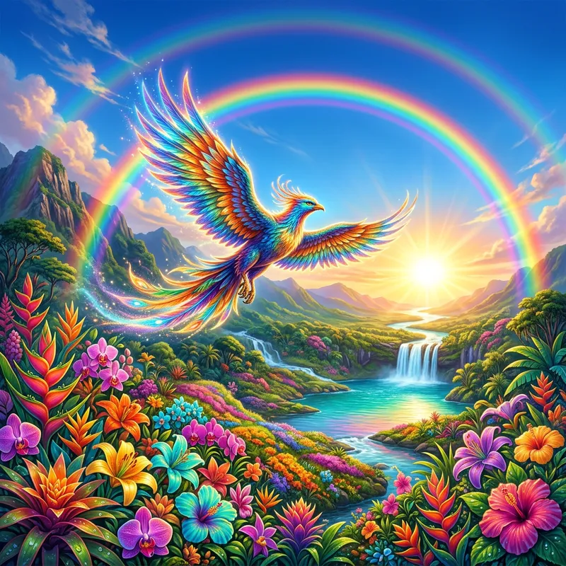 An eye-catching, vibrant image filled with intense colors. The scene could include nature elements such as exotic flowers in full bloom, enhanced with rainbows stretching across a clear sky and a radiant sun shining brightly. Over the scene, a majestic creature, perhaps a mythical bird, takes flight, its wings shimmering with the color spectrum.