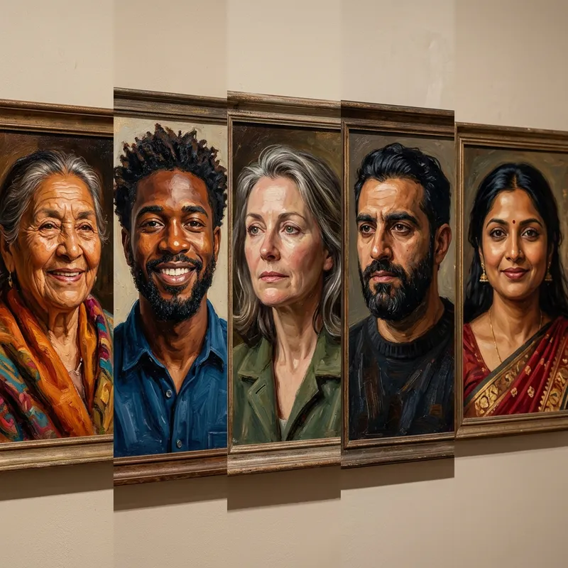 Portraits of people painted with oil paints. Capture the richness and depth of the colours, the texture of the brushstrokes, and the luminosity particular to this medium. Include subjects from varied descents such as Caucasian, Hispanic, Black, Middle-Eastern, South Asian, etc, portrayed in a multitude of expressions showcasing a wide range of emotional depth.