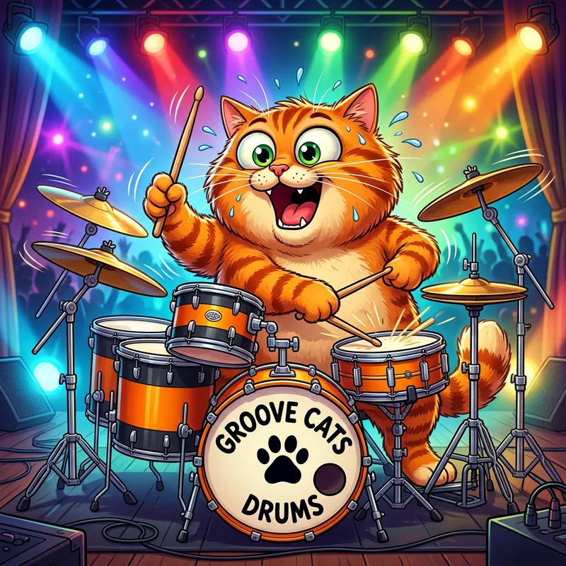 A vibrantly colored, oversized orange-striped cartoon cat is seated behind a drum kit. The cat's green eyes are bulging out in excitement as it animatedly strikes the drums with a pair of drumsticks held securely in its paws. Sweat beads are sprouting from its head, illustrating the intensity of its performance. The drum kit consists of a large bass drum, a few tom-toms, cymbals, and a snare drum, all organized in a semicircular arrangement around the cat. The backdrop has a feel-good ambiance, augmented by multicolored stage lights that create a veritable visual symphony in the background.