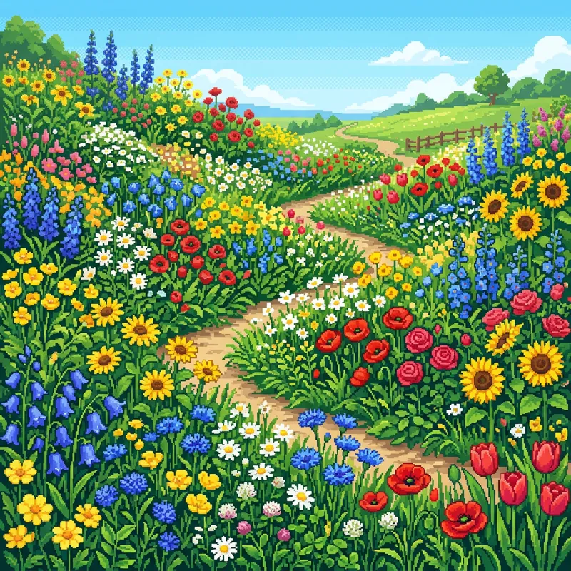 A vibrant illustration of pixelated flowers. The scene contains a variety of flowers in different shapes and colors, presenting a rich mixture of blue, yellow, red and white pixel flowers. Surrounding areas have green pixelated leaves and stems, while the background is a clear sky-blue, giving the image a sunny landscape feel. The perspective is from slightly above, allowing an eye-catching view of the floral assortment. Despite the use of pixels, the image maintains a certain fluidity, with each pixel acting like a brush stroke in a pointillist painting.