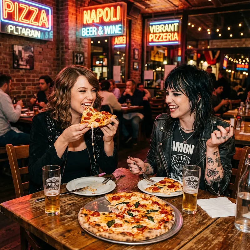 A woman with chestnut hair similar to a pop singer enjoys a slice of cheesy pizza, while sitting across from another woman who has a distinct rock vibe about her. The two are having a fun dinner in a vibrant pizzeria, surrounded by the warm glow of neon signs.