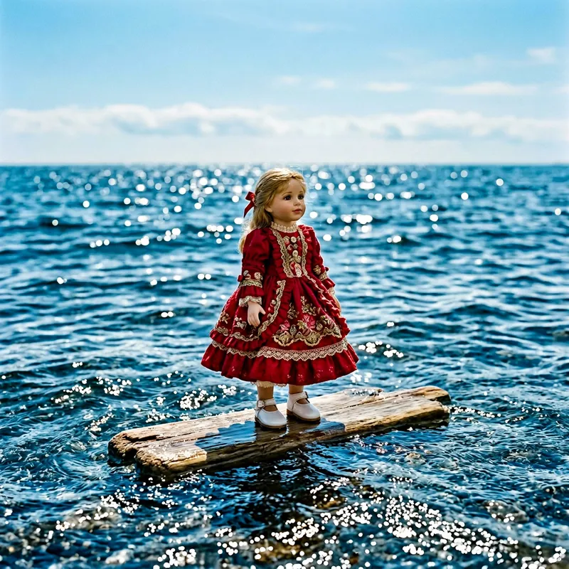 A meticulously crafted doll is elegantly dressed in a vibrant red color dress. The dress is adorned with intricate patterns, and the doll's small feet are covered by polished white shoes. The doll is placed strategically on the endless expanse of the sea. The azure blue of the sea creates a stark and beautiful contrast with the doll's red dress. The waves gently lap at the doll's white shoes, reflecting the sunlight brilliantly. It's a serene and poetic scene, where the doll appears as though it's about to embark on an adventurous journey across the sea.
