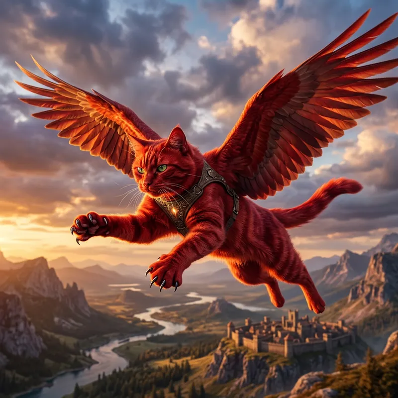 A striking and unusual image of a cat. This is no regular feline, this cat is a beautiful shade of vibrant red. Imagine this cat with a pair of wide, mighty wings, powerful and majestic, that allows the cat to soar through the skies. Moreover, this cat isn't just for show- it's a fighter. Envision the cat in a heroic pose that showcases its fighting spirit, with its claws out, displaying a sense of bravery and courage.