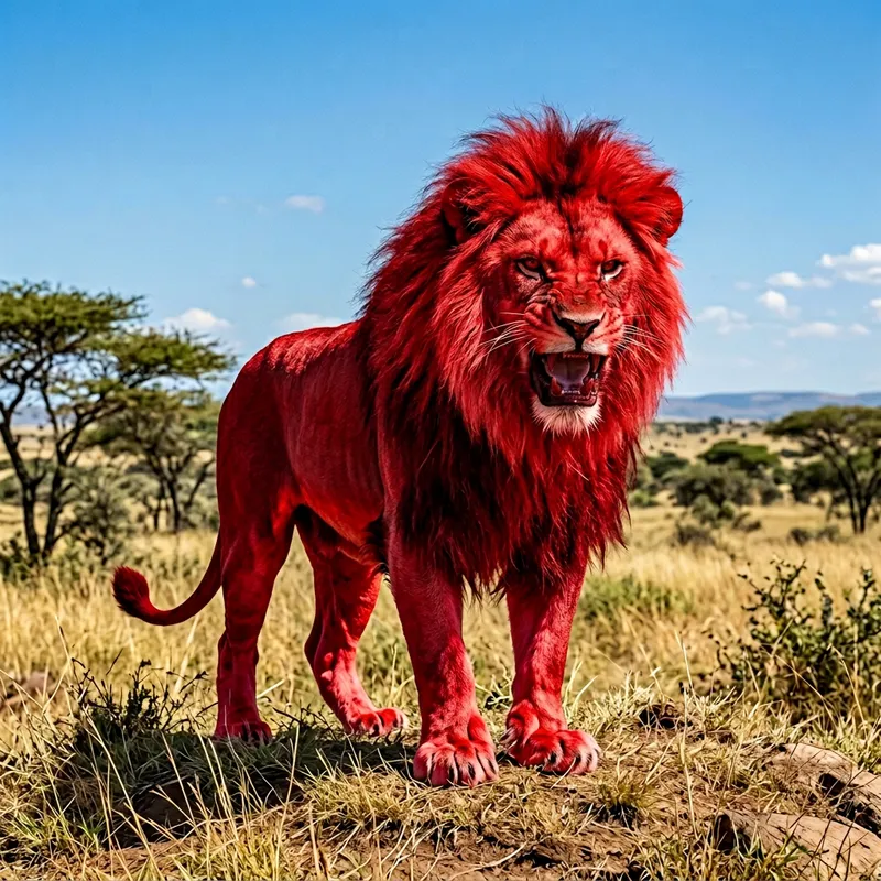 A vibrant and striking lion rendered entirely in shades of red. From its flowing mane to its powerful body, the entire creature is cloaked in red. The lion's eyes have a fierce glint, its sharp claws and teeth are visible, demonstrating its intimidating prowess. This unique lion, with its monochromatic red coloring, stands amidst its natural savannah habitat under a clear blue sky, and this stark contrast makes it an arresting sight to behold.