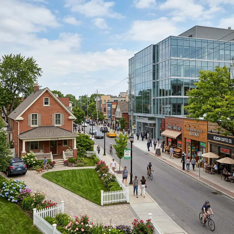 A distinct street view of a vibrant residential and commercial property. On one side, a charming two-story residential house with a green manicured lawn, a white picket fence, and colorful flowers alongside the driveway. The house exhibits traditional architectural features like a gabled roof and brick facade. On the other side of the street, a bustling commercial property featuring a multi-storied glass-fronted modern office building with people marching in and out. Next to it, small local businesses like a bakery, bookstore, and a coffee shop with inviting storefronts and neon signs illuminating the sidewalk.