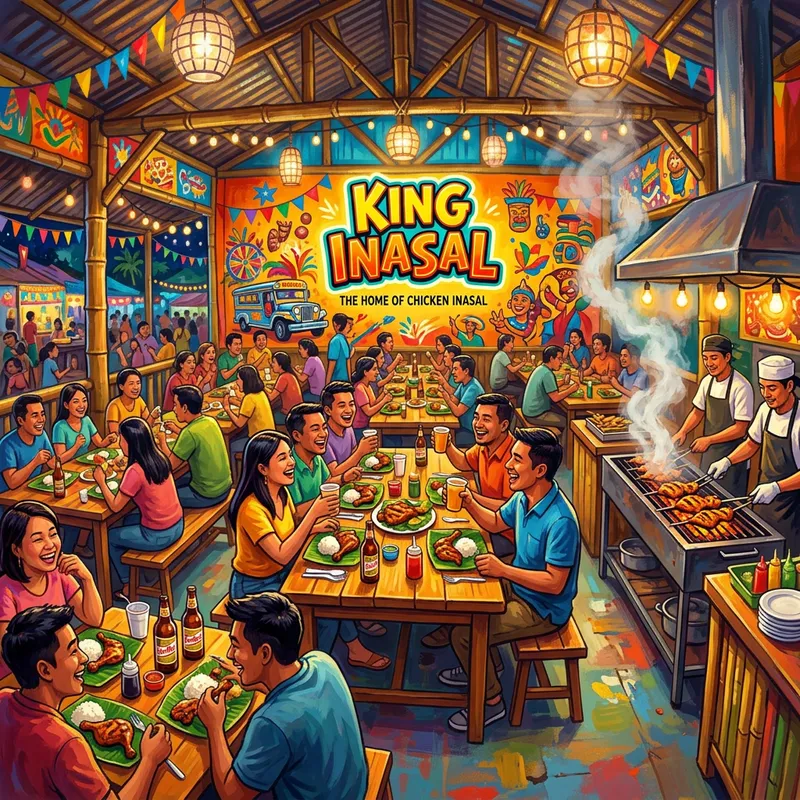 vibrant restaurant interior in the Philippines, showcasing the lively atmosphere of 'King Inasal', painted with bright tropical colors, customers enjoying delicious grilled dishes, captured in a wide-angle lens to encompass the bustling scene, digital painting with playful brushstrokes, cultural celebration.