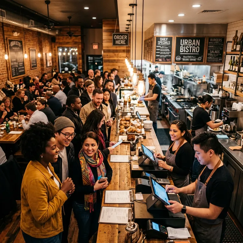 Photograph capturing a bustling restaurant scene. A diverse group of customers, composed of different genders and ethnic backgrounds, are seen standing in a long queue at the counter. The counter is highlighted with warm lighting, making it the center of attention and sending out an inviting ambiance. Busy restaurant staff can be seen behind the counter, taking orders and preparing meals. The overall atmosphere is lively, energetic, and full of chatter.