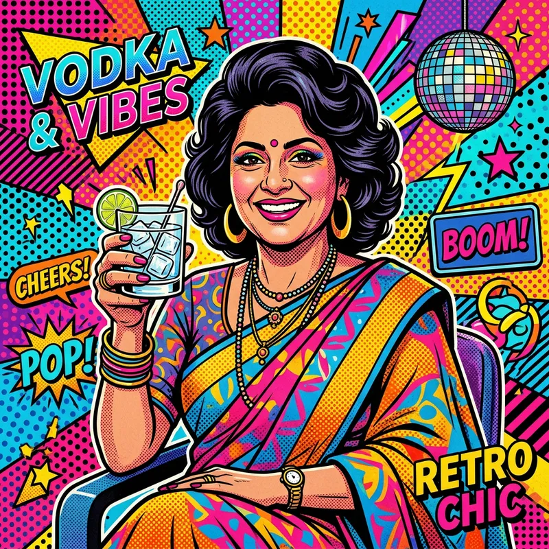Illustrate a retro-style pop art scene featuring a middle-aged woman of South Asian descent. She's holding a glass of vodka, resplendent in vibrant colors, complete with halftone designs. Her garb is a mix of modern and classic clothing. The picture should exude timeless charm and radiate a distinct 80s feel.