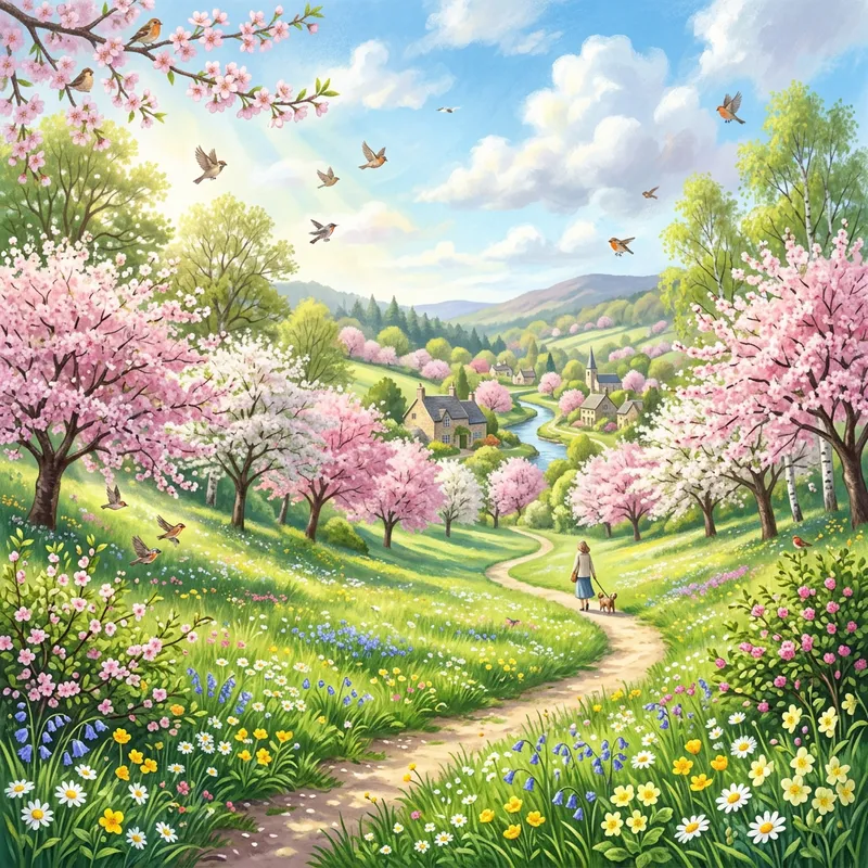 Illustrate the arrival of spring displaying a lush landscape where trees are blooming with pink cherry blossoms and many other flowers are sprouting from the ground beneath. Include the vivid hues of green marking the fresh growth of grass and leaves. Additionally, portray the bright blue sky peppered with fluffy white clouds. The sun is also warming the scene with its gentle rays peeking through the foliage. There are few birds chirping and fluttering in the distance. Ensure to use a diffusion-based style to encapsulate the picturesque serenity and vibrant colors that define the beautiful season.