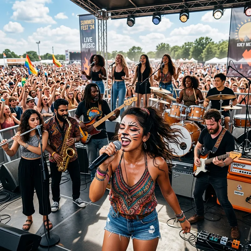 On a hot summer day, a lively concert is taking place outdoors. In the foreground, a Hispanic girl with makeup that resembles a cat is passionately singing into a microphone. Further in the background, a Middle-Eastern flutist, a South Asian saxophonist, a Black bass guitarist, a White guitarist, and backing vocalists of various descents harmoniously fill the air with music. Lastly, drummers of different genders and descents keep the rhythm going, creating a dynamic and inclusive atmosphere.